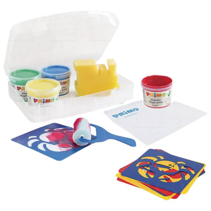 Opis: set od 4 boje x 100 g ( plava, crvena, zelena i žuta); 5 šablona, spužvasti valjak, spužvu, kist, podlogu